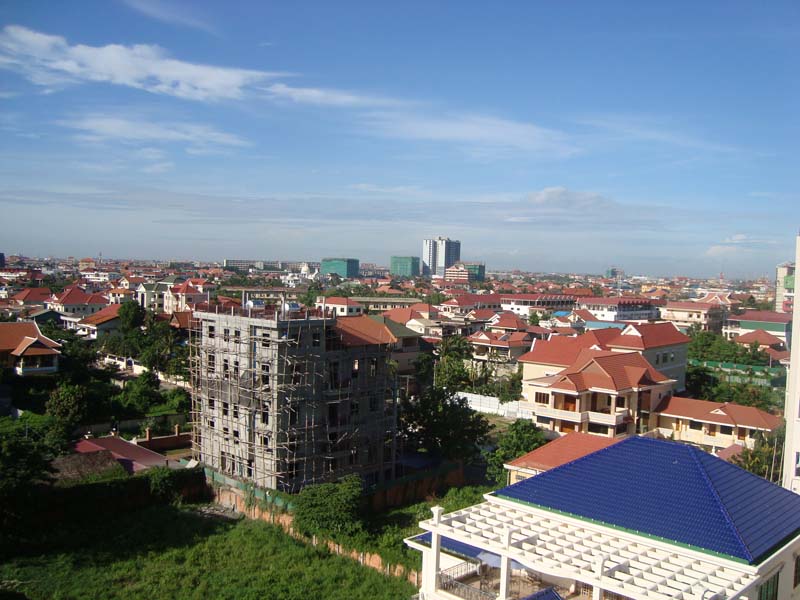 向こうの方に高くそびえ立つ建物が、完成間近のカンボジア随一の高層ビルです。(次のページもご参照下さい。)