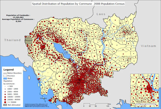 次に、人口分布図を見てみます。上記センサスをもとにつくられた地図を見てみますと、人口の多くは、プノンペン周辺に集中していることがわかります。統計上は、プノンペン周辺9州(全部で23州)に全人口の57%が、集中しています。