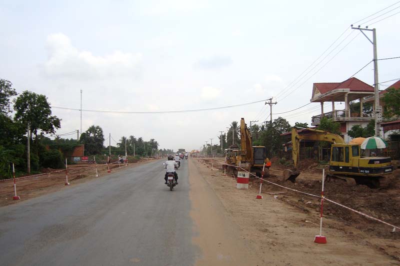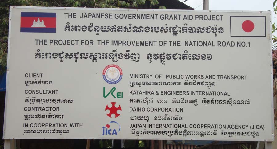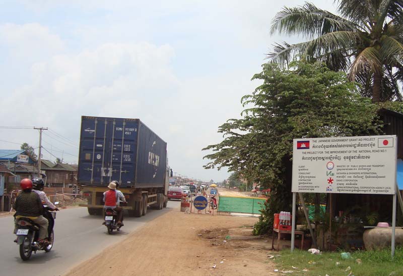 プノンペンからヴェトナムのホーチミンシティにつながる国道1号線の拡幅工事が始まっています。これまでADBやJICAの支援により大半の区間は整備され、立派な道が通っています。しかし、プノンペン市内から30分くらいまでの距離は、せまいガタゴト道のままでした。そこをJICAの無償援助により、拡幅して立派な舗装道にする計画です。日本の大豊建設が請け負って工事をしています。
