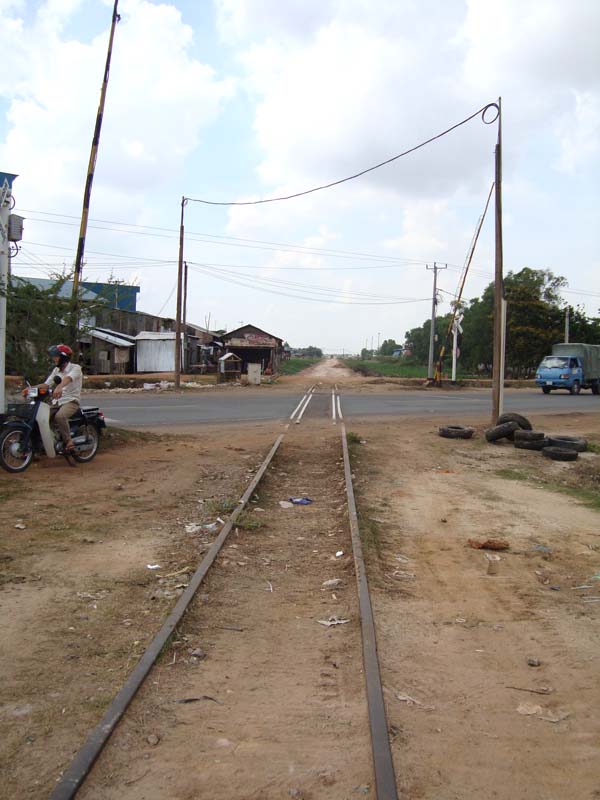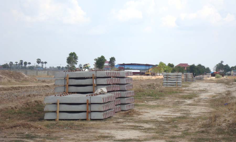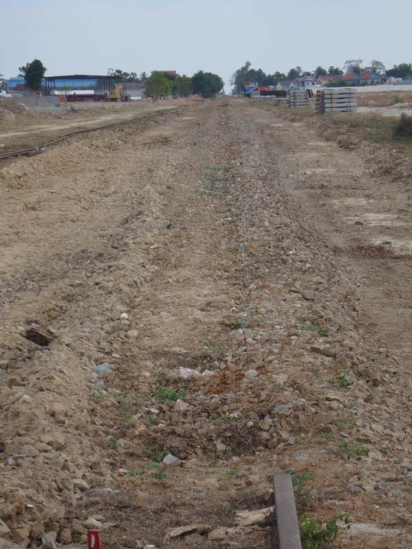 カンボジアには、プノンペンからタイ国境近くまで伸びる東西線と、シハヌークヴィルの港まで続く南北線の2本の鉄道があります。しかし、内戦後ほとんど機能が停止状態でした。そこにアジア開発銀行(ADB)の融資で、復興工事が始まっています。南北線は、物流量の増加が期待されることから、画像のように枕木をコンクリートに代えることになっています。