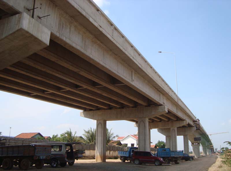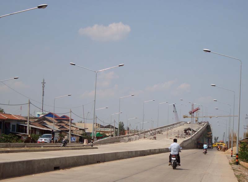 プノンペン市内から、国道5号線を北に30分ほど車で走ると、トンレサップ川を渡り国道6号線につながるプレッククダム橋が完成間近です。この橋は、中国の援助で中国の業者によって建設されています。料金所も作っていることから、有料道路となるのでしょう。
