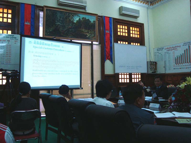 最初にペン・シマン関税局長(Dr. Pen Siman, Delegate of the Royal Government of Cambodia)から開会の挨拶があり、その後、ペン・サマアディレクター(Dr. Pen Sam Ath, Director of Legal Affairs, Audit and Public Relation Dept., Customs & Excise General Dept.)から具体的な改革政策の説明が行われました。なお、このお二人は、兄弟です。