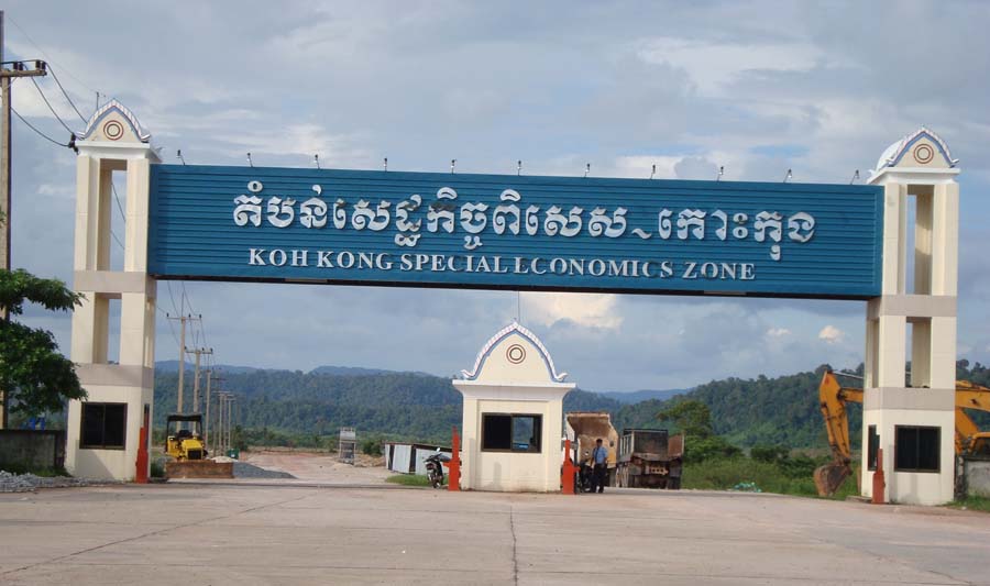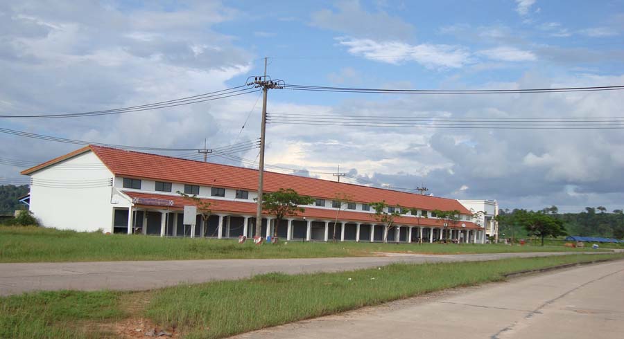 橋を渡ってそのまま5分ほど走ると、コッコン経済特区の門が見えてきました。この経済特区は、カンボジアの有力な企業家で上院議員でもあるリー・ヨンハット(Ly Yong Phat)氏が開発しており、韓国ヒュンダイ自動車の組立工場を誘致したことで、話題になっています。実際現場を見てみると、まだ工場建設が始まっていないようです。道路等のインフラも十分整備されているとは言えず、電線の引き込みだけ確認できました。表の道路沿いには、商業施設らしい建物がありますが、大半はシャッターが閉まっており、閑散としています。