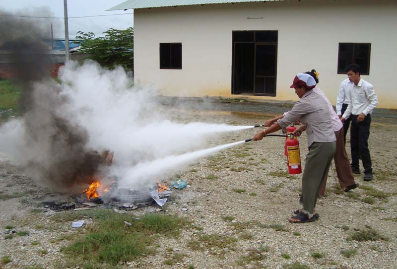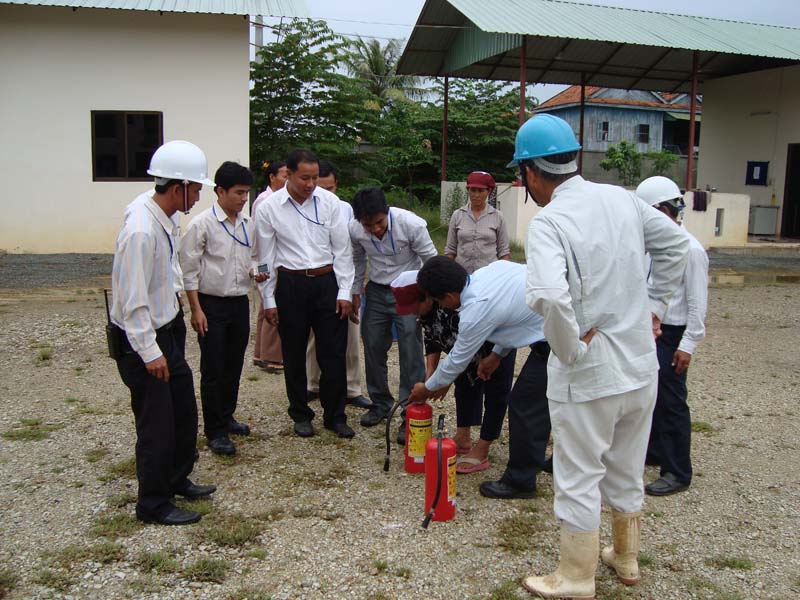 まず、事務所に隣接する社員食堂のキッチンから出火したという想定で、賄いのおばさん中心に消火器を実際使って、消火訓練をしました。次回は、工場から出火したという想定で、消防車に実際来てもらい消火訓練を行う予定です。なお、PPSEZは正確には、大半の敷地がカンダール州に属し、一部プノンペンに属しています。最初は、距離的にも近いプノンペン消防署に協力を要請したのですが、「いや、あんたらのところはうちらの管轄じゃないから、カンダール州の方に聞いて。」と言われ、仕方がなくより遠いカンダール州の消防署に協力を要請することにしました。まったく役所の融通のなさに、スタッフもがっかりです。将来的には、自前の消防車と消防団を用意するつもりでいます。