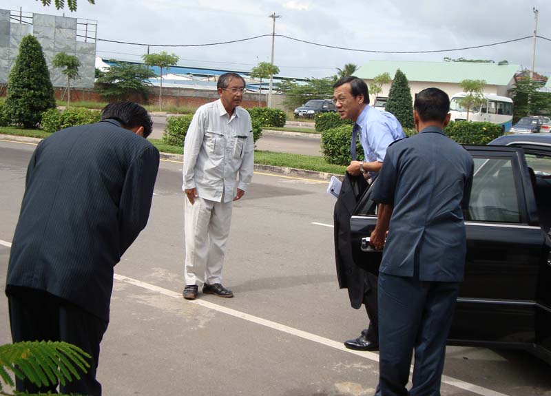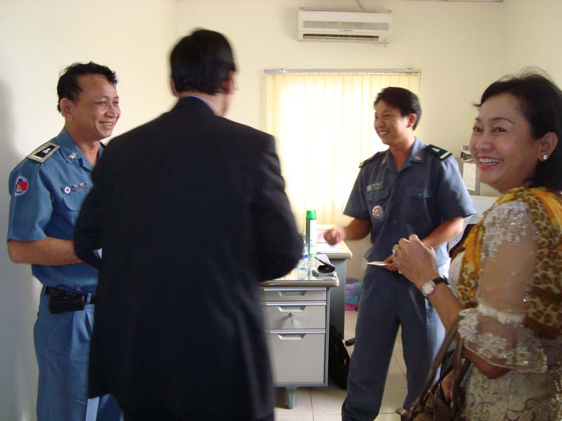 まずはパワーポイントを使って、PPSEZの概要をご説明し、その後、カンボジアの各省庁から派遣されてきている「ワンストップサービスセンター」の役人たちを表敬訪問されました。画像中央は、通関手続きを担当する税関職員(普段はワイシャツ姿の時も多いのですが、今日は制服でバシッときめています。)、右は工場で労務問題が発生した時に、直ちに工場にかけつけ仲裁に入る労働省の職員です。