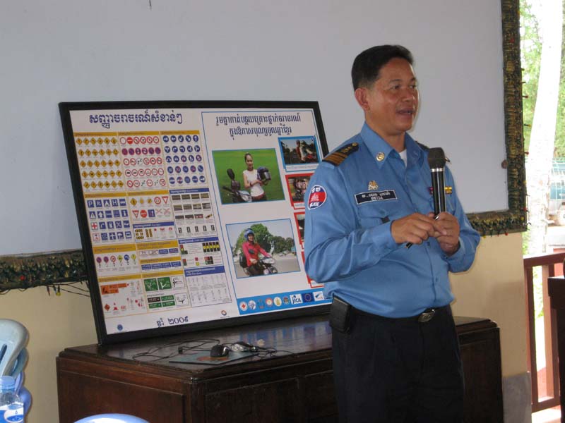 交通安全指導担当の警察官を招いてのレクチャー。カンボジアでは今まで、道を走っている車やバイクを止めては、裏金を要求する悪徳警官の印象しかなかったのですが(失礼!でも私も経験あるから本当)、この日ばかりはとても頼もしいおまわりさんに見えました。参加者たちも予想を良い意味で裏切って、目を輝かせながら熱心に聞き入っていました。その後、グループに分かれて、PPSEZスタッフを含めてグループディスカッションに移り、ドライバーたちにも発言してもらい、交通ルールに対する自覚を高めていきました。