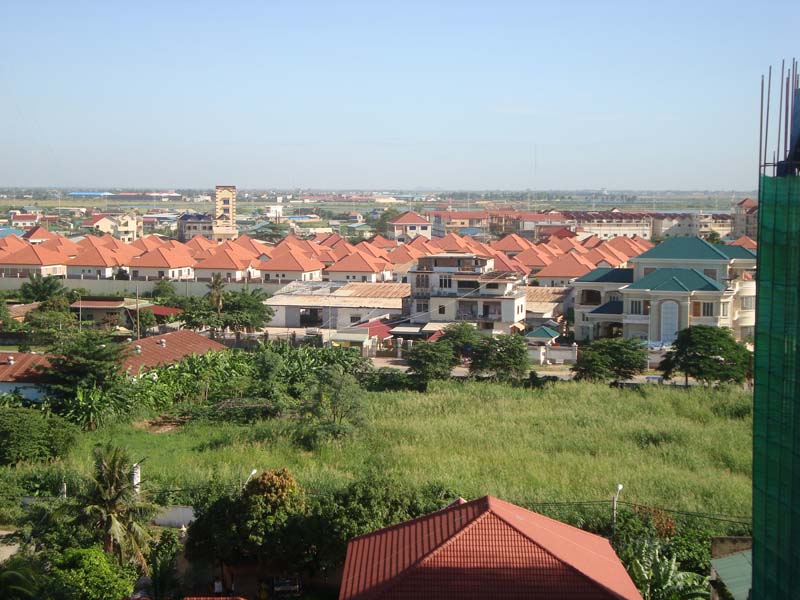 プノンペンの北西方向に向かって撮った風景です。カンボジアは山が少ないので、向こうの方は果てしなく平地が広がります。マレーシアと地場資本が開発する高級ヴィラ(Sunway Cana City)が見えます。