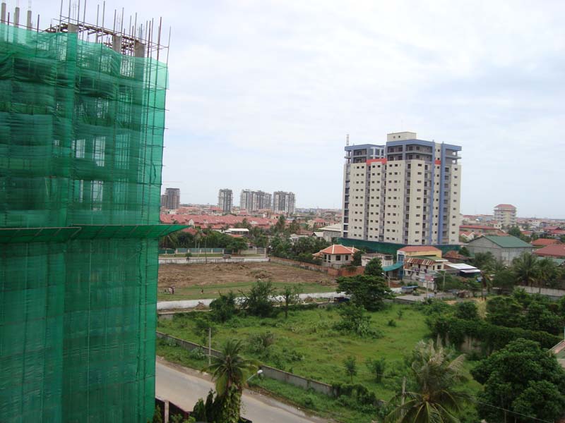 向こうの方に高くそびえ立つ建物が、完成間近のカンボジア随一の高層ビルです。(次のページもご参照下さい。)