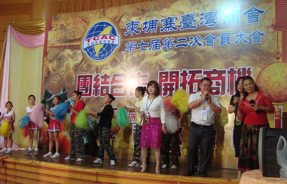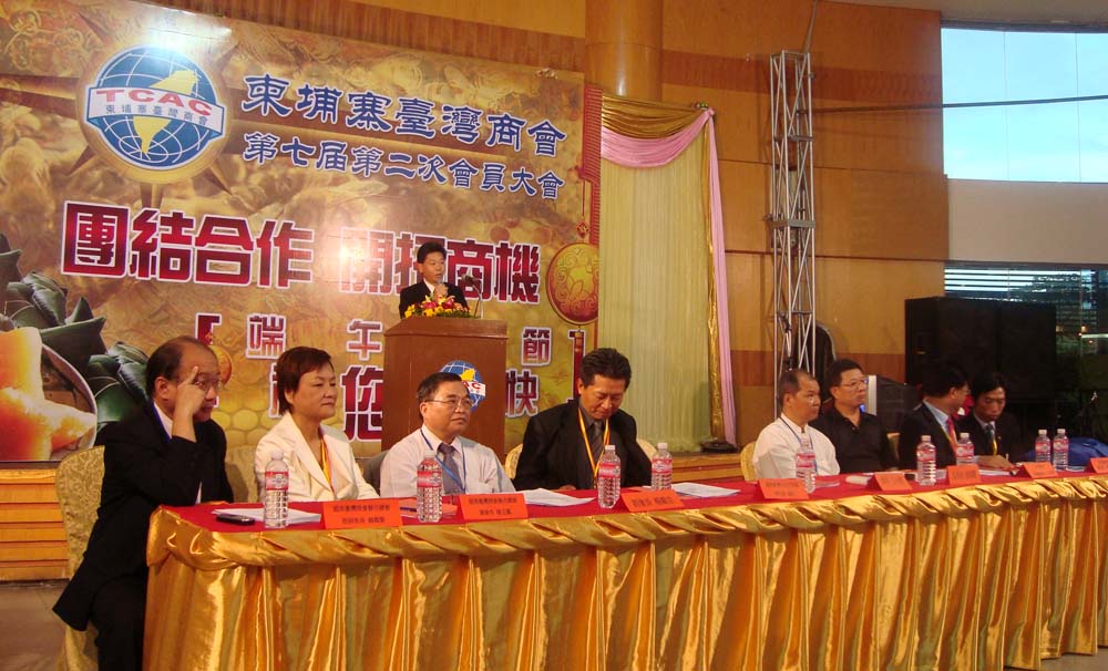画像のように、見るからに台湾ビジネス界の集まりという色使いと装飾の舞台が用意されており、「団結合作 開拓商機」のスローガンを掲げ、台湾企業のバイタリティを感じ取ることが出来ました。現在、カンボジアには200社余りの加盟企業があるとのことです。