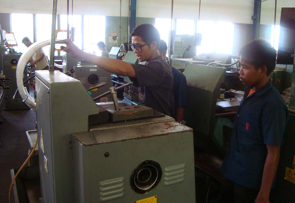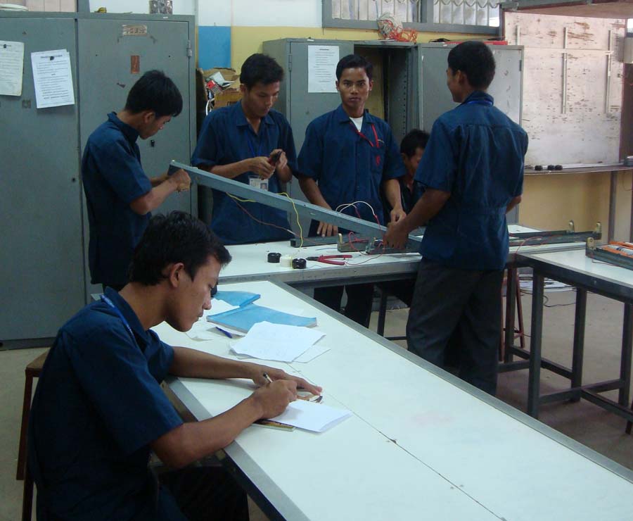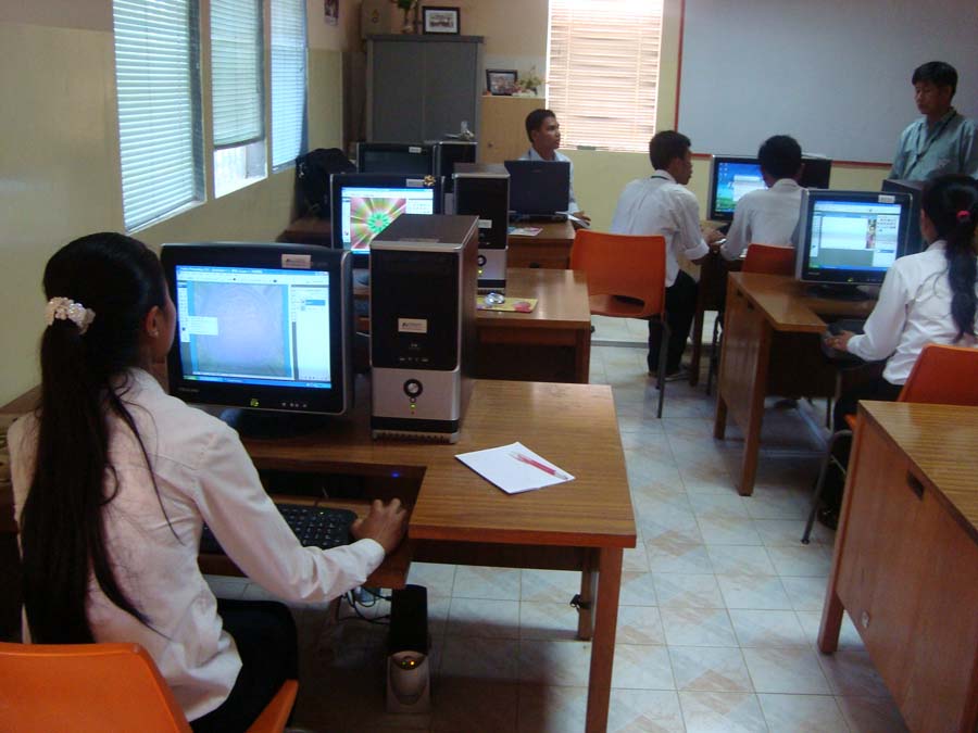 電気課は、配線の勉強をしていました。機械課に行くと工作機械で金属加工をしていました。また、コンピューター教室では、ウェブデザインを勉強しており、ホームページのデザインやカタログづくりの仕事を外から受注し、売り上げを学校運営の一部に充てているとのことです。その他、自動車課、溶接課、印刷課などがありました。プノンペンだけでも他2校分校があり、会計、秘書、ホテルサービスなどを教えています。