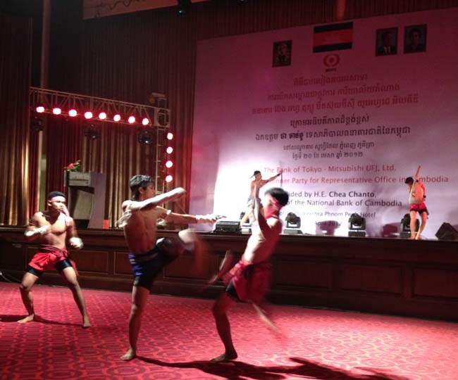 この後の会食中に、色々な余興で楽しませてもらいました。画像左は、カンボジア版SMAPのようなグループの歌と踊りです。カンボジアのポップカルチャーも進化していますね。画像右は、アンコール王朝時代から伝承され、タイのムエタイの源流と言われている「ボッカタオ」という古武術の演武です。格闘技好きの私としては、いつかこれを式典でやろうと思っていたのですが、先を越されました。